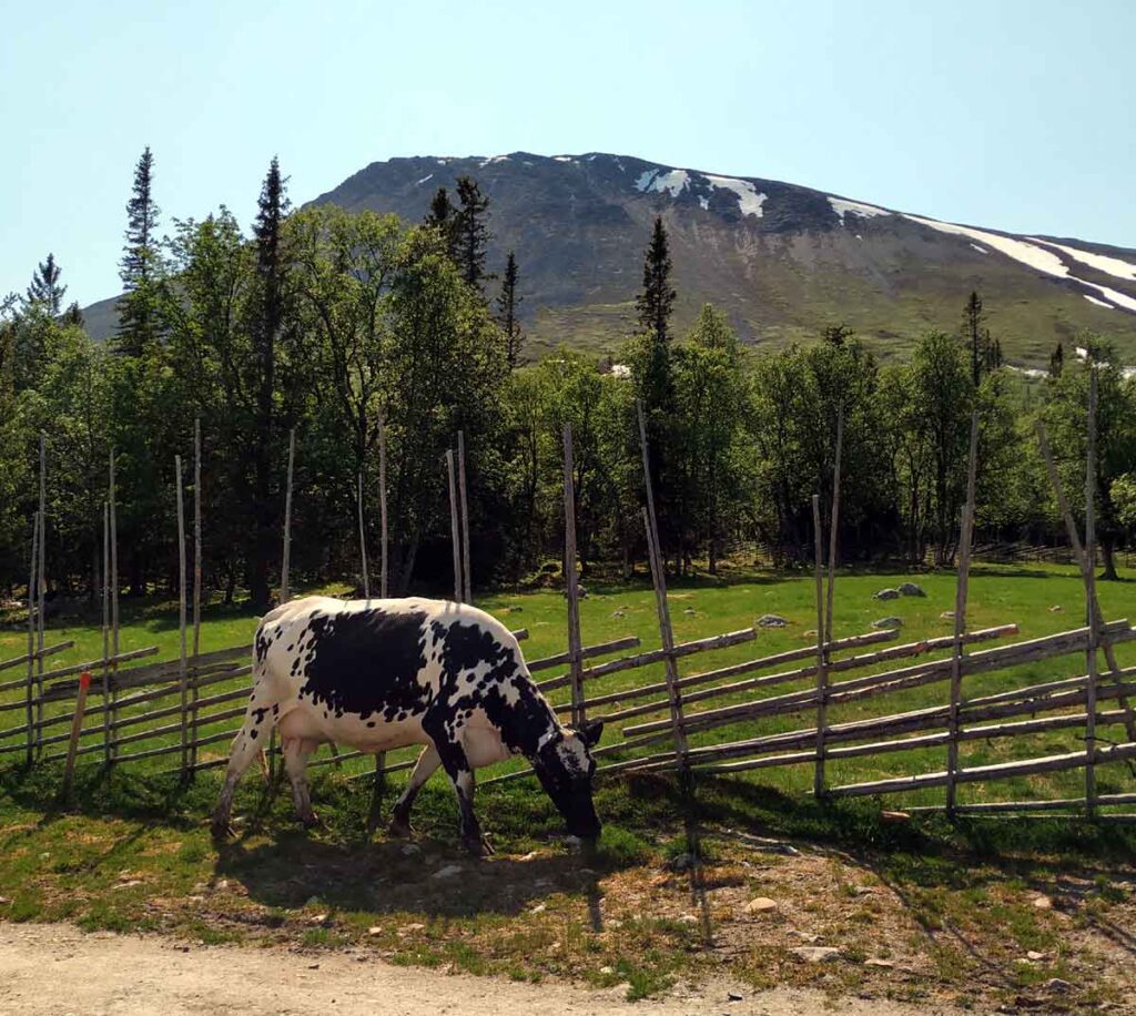 Das Fjäll-Rind oder schwedische Bergkuh trägt durch das Beweiden zu diesem komplexen Ökosystem bei. Leider gibt es von der Fjällkuh-Rasse nicht mehr viele Individuen. Darum sind wir Mitglied in Verband zur Erhaltung alter Landrassen. Wir halten auch Ziegen der heimische Jämtland-Rasse, die direkt in der Nachbarschaft aufgezogen werden.