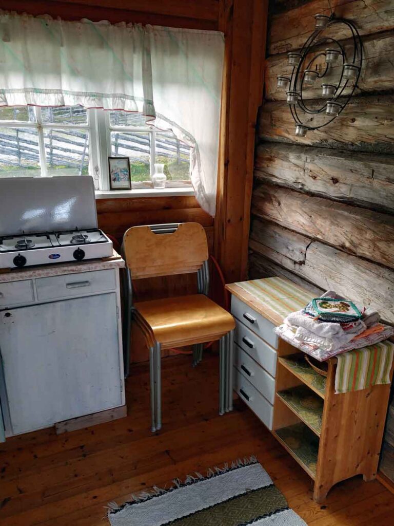 Sie kochen und versorgen sich mit dem Holzofen oder über dem Gaskocher. Ein Kaltwasser-Zugang ist installiert, aber Sie müssen das Wasser selbst erhitzen. In der Hütte gibt es weder Strom, Dusche oder WC, aber mit Solarpanelen und Kerzen sorgen wir für Beleuchtung. Im nordischen Sommer ist es allerdings fast den ganzen Tag über hell.